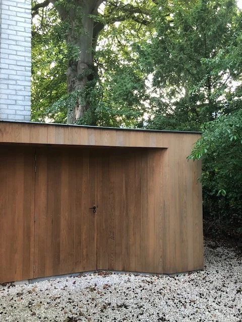 Deze grote, parkachtige tuin met veranda en houten bijgebouw realiseerden we in een oude villawijk aan de rand van Hilversum. Prachtige oude bomen vormen de structuur van de tuin. De layout van de tuinis simpel gehouden, met een groot grasveld om op te spelen. Omdat de tuin op de top van een heuvel ligt, heeft de de tuin twee niveaus, met elkaar verbonden door een brede trap. Stoere eiken balken vormen de grondkering, de rand van de borders en een zitbankje. Achter het huis is een veranda gebouwd met een vaste loungebank en een houtopslag. Om de hoek, aan de zijkant van het huis hebben we een berging van red cedar gebouwd, met een minimalistische belijning.